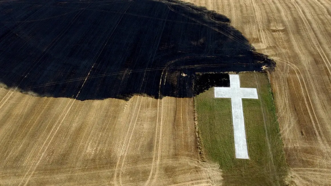 Във Великобритания също се стигна до рекордни горещини и пожари - снимката показва как огънят е унищожил част от нива край военен мемориал в Кент.