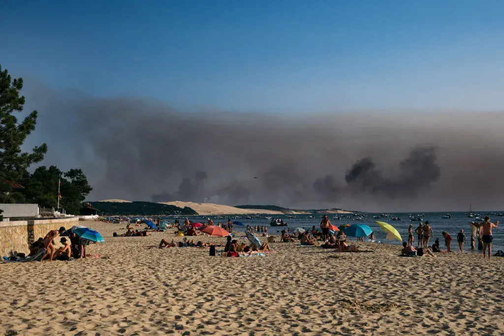 Югозападна Франция също стана жертва на горски пожари - в Ландирас хората наблюдават дима от огъня край плажа.