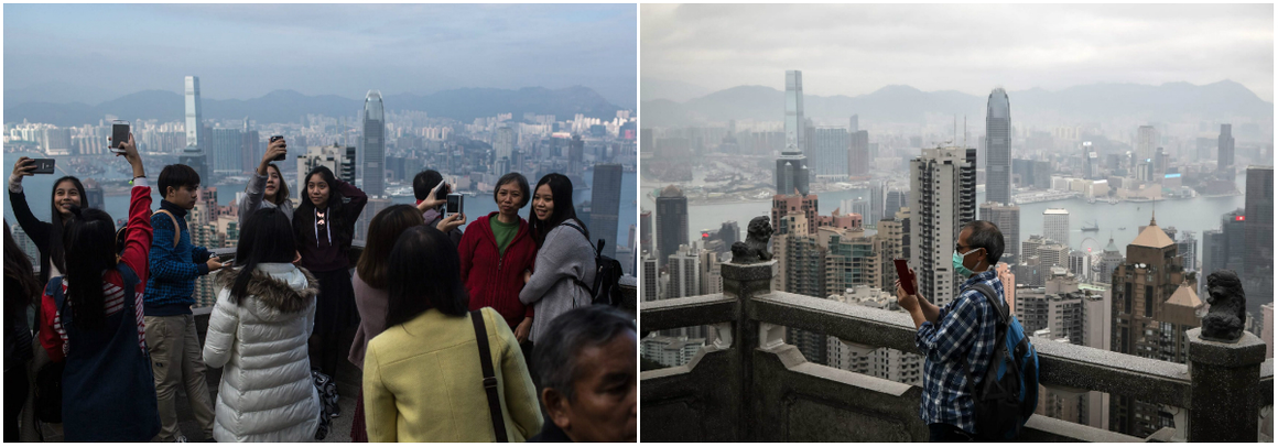 Декември 2015 / Март 2020 - Туристи се снимат на връх Виктория в Хонконг.
