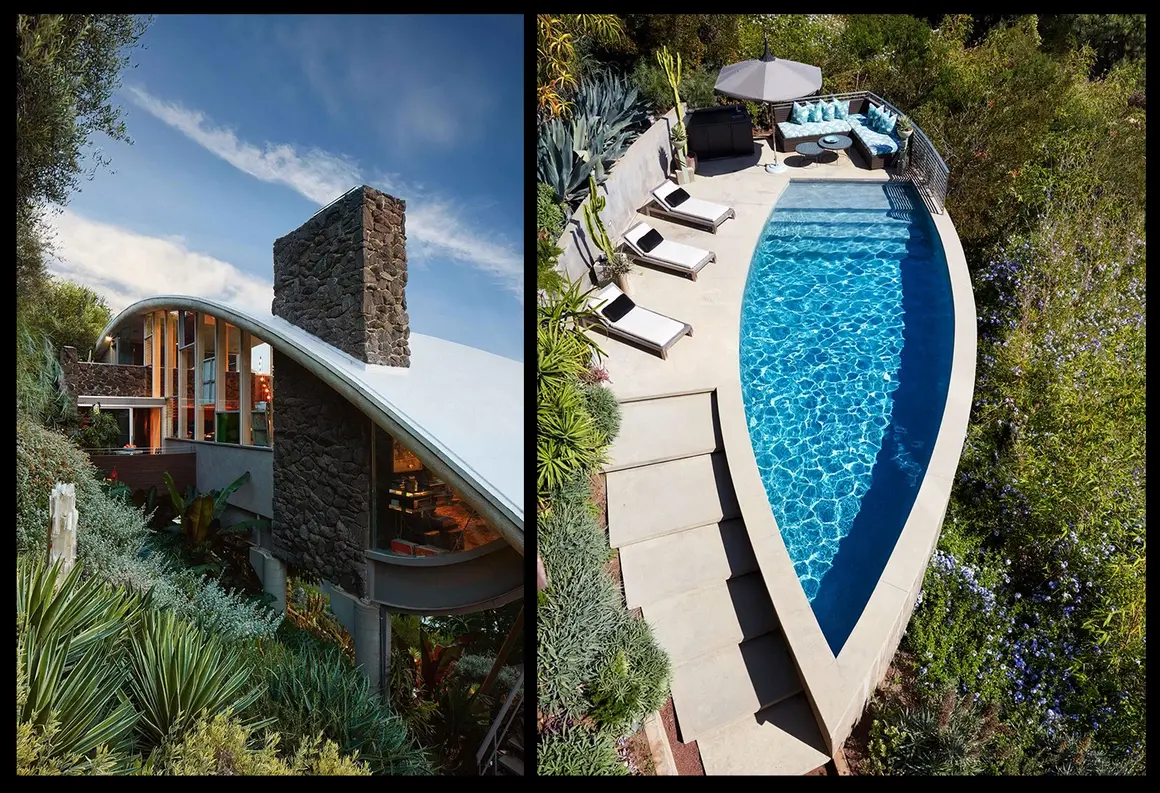 Той и Дамашке добавят бетонна тераса под къщата и монтират басейна по плановете на Лаутнер. Елипсата е сред запазените форми на архитекта.