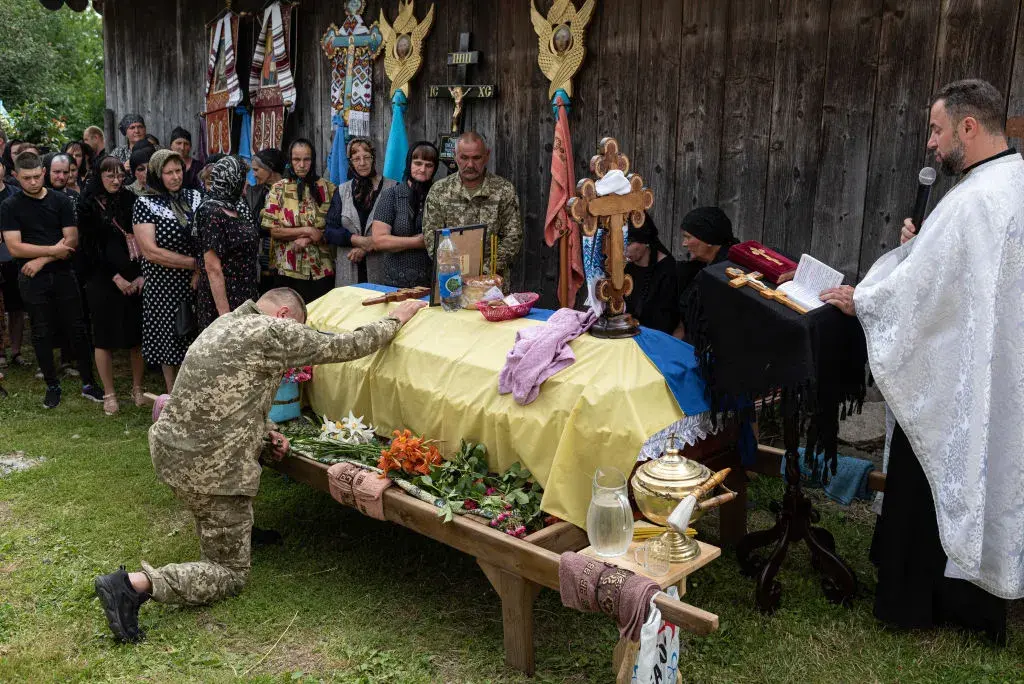 Била Криниця, Украйна. Украински военнослужещ отдава почит по време на възпоменателна служба за 33-годишния Александър Гринчук, който беше убит на 21 юни в района на Луганск.