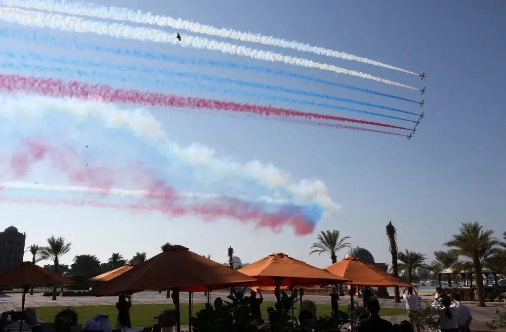 Той беше посрещнат в ОАЕ с пълен кавалерийски ескорт и кортеж, а национален отбор по въздушна акробатика изрисува руското знаме в небето, предаде BBC.