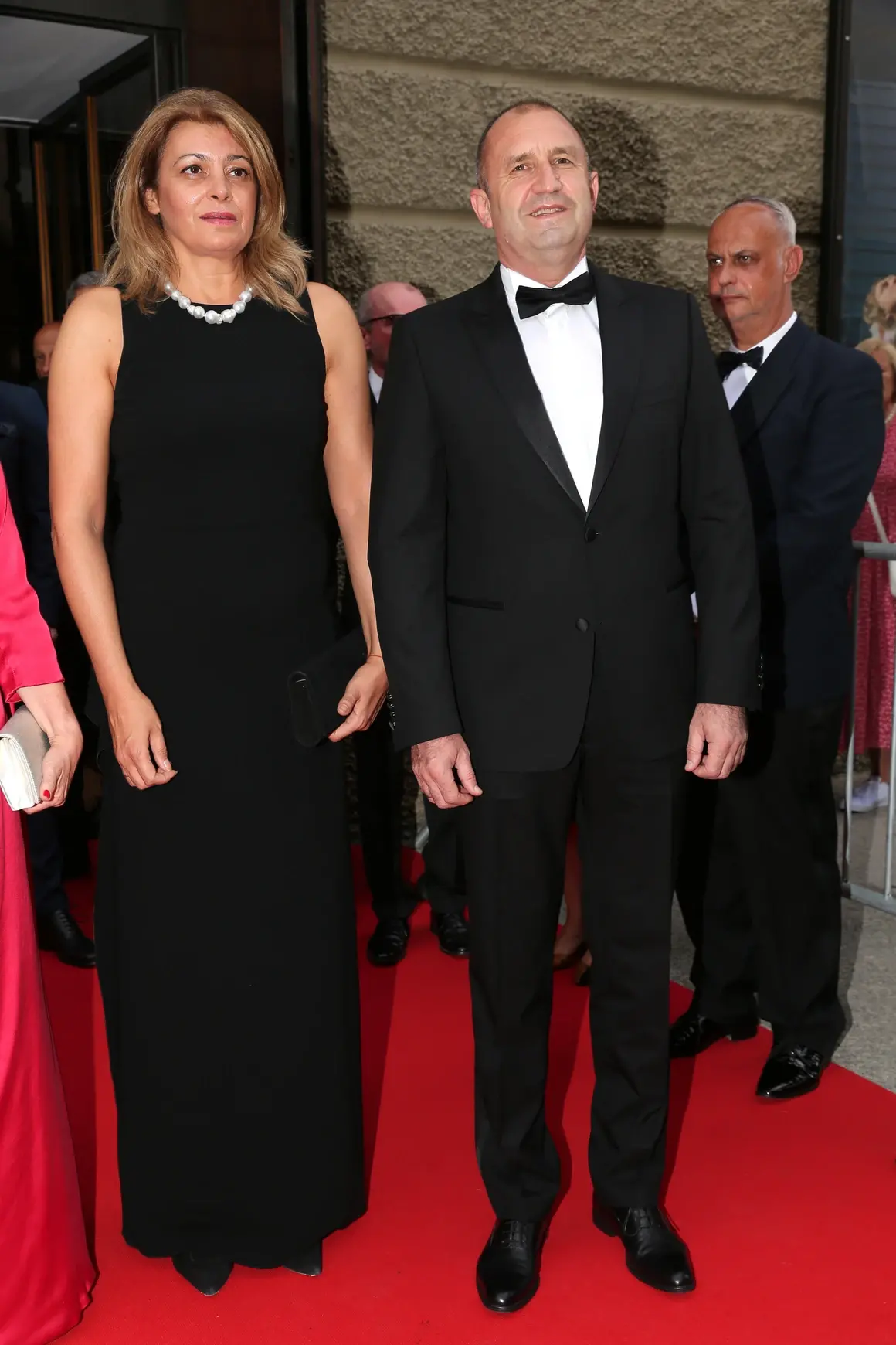 Радева се появи с дълга черна рокля без ръкави, а българският президент – в черен смокинг с папийонка и бяла риза.
