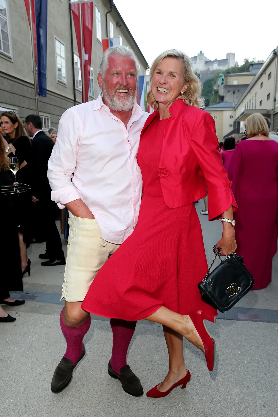 Германската писателка и певица Хера Линд впечатли с червена рокля, а съпругът ѝ Енгелберт Лайнер заложи на къси дънкови панталони и дълги червени чорапи.