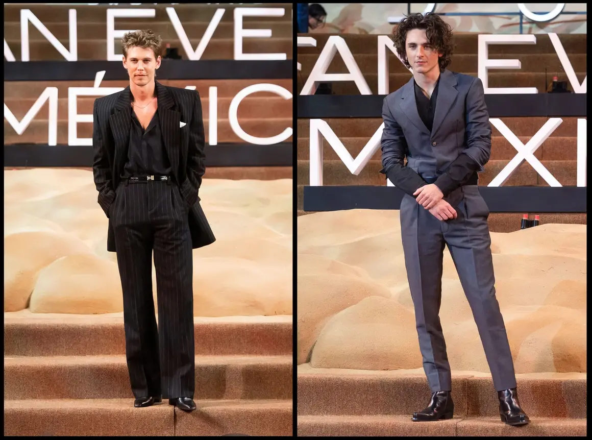 Остин Бътлър носи костюм на Saint Laurent (той е и лице на последния парфюм на бранда), Шаламе е с Prada.