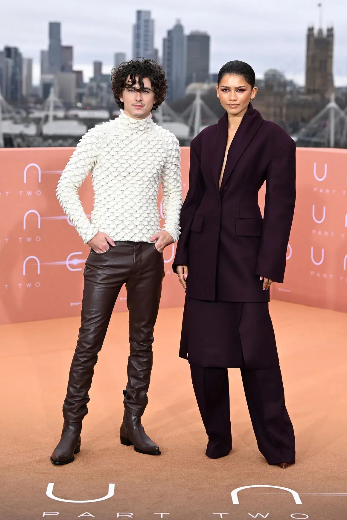 Тук виждаме Шаламе и Зендея в Лондон през деня. Той е с тоалет на Bottega Veneta, модната къща, която брандира Великата китайска стена. Зендея с костюм на сръбския бранд Roksanda.