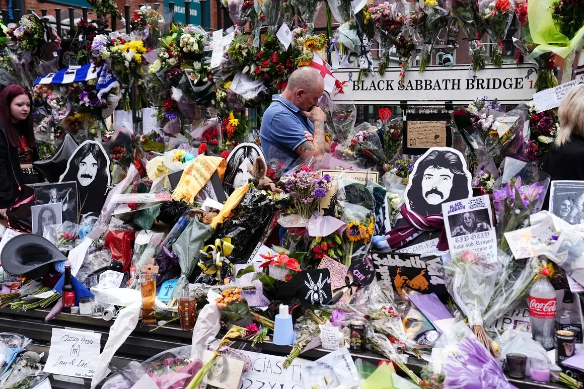 Съпругата Шарън и децата на Озбърн Джак, Кели, Ейми и Луис спряха траурната процесия пред моста Black Sabbath, отрупан с цветя и картички.