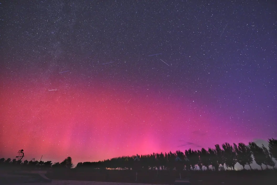 Полярни сияния озариха небето над България и други части по света в ярки нюанси на червено и лилаво.