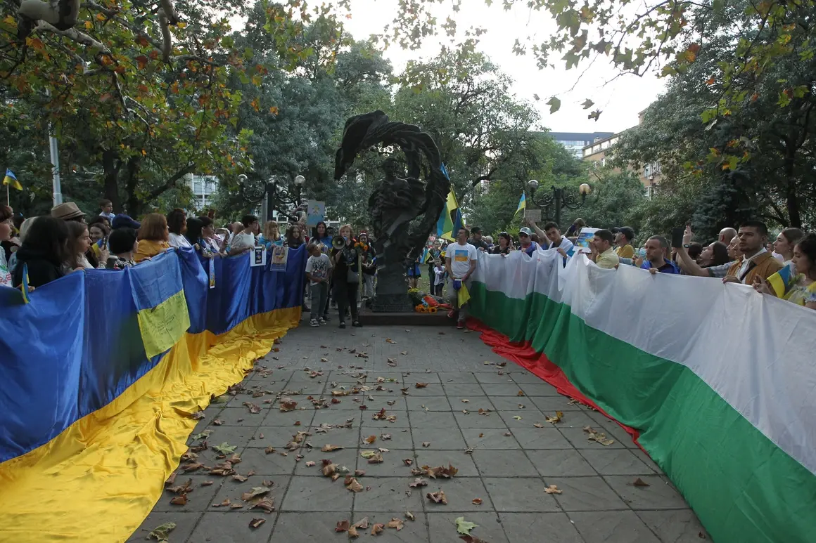 Хората с български и украински флагове стигнаха до паметника на поета Тарас Шевченко на площад "Възраждане" в столицата.