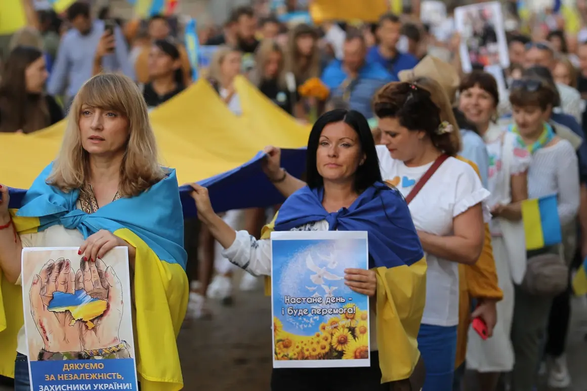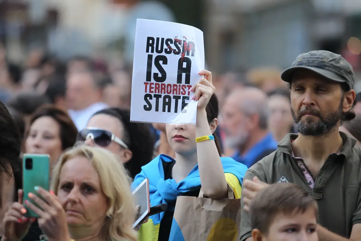 "Русия е терористична държава", гласи надписът на един от плакатите. Точно в деня на националния празник руската армия бомбардира влак край железопътна гара в селището Чаплино в Днепропетровската област, при която загинаха 25 души.