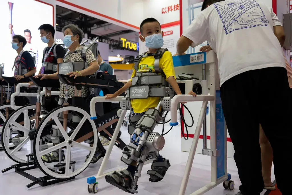 На конференцията посетителите изпробват рехабилитационни роботи, наречени "AiWalker", на щанда на китайската компания "Beijing Ai-Robotics Technology", които да помогнат на пациенти, страдащи от заболявания на мускулите, гръбначния мозък и други проблеми, свързани с движението.