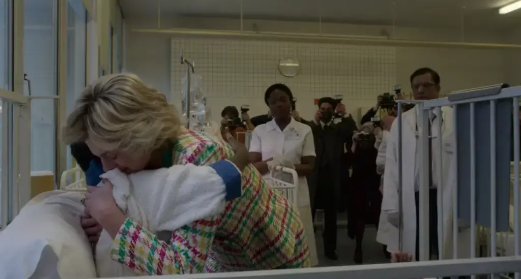 Посещението на Даяна в Ню Йорк през 1989 г. наистина включва визита в детското HIV-отделение на болница в Харлем. И наистина принцесата прегръща едно от децата, като според директора на педиатрията д-р Маргарет Хегарти това се е случило без предварителна подготовка, изцяло по нейно желание.