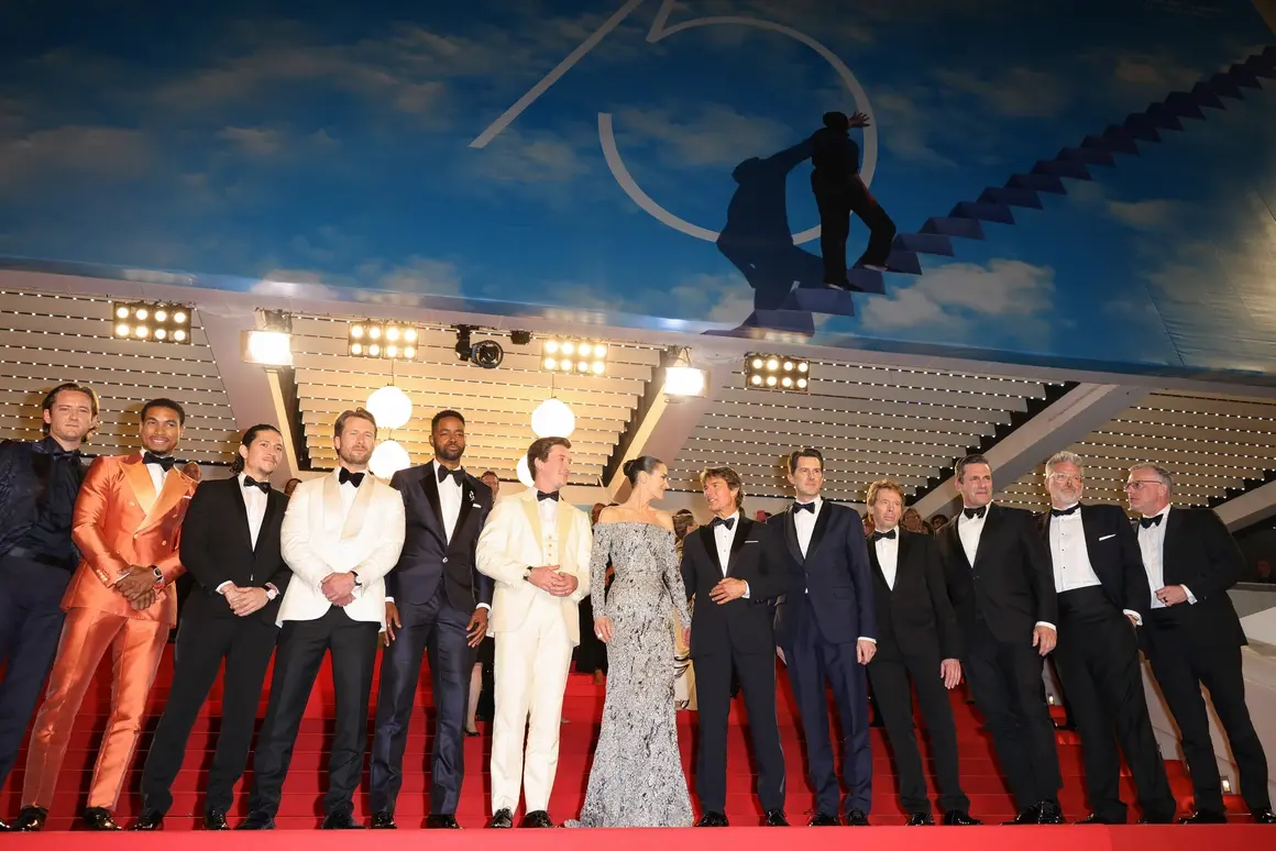 Актьорите от "Top Gun Maverick" заедно с продуцента Джери Брукхаймер приемат аплодисментите на феновете в Кан след края на прожекцията.