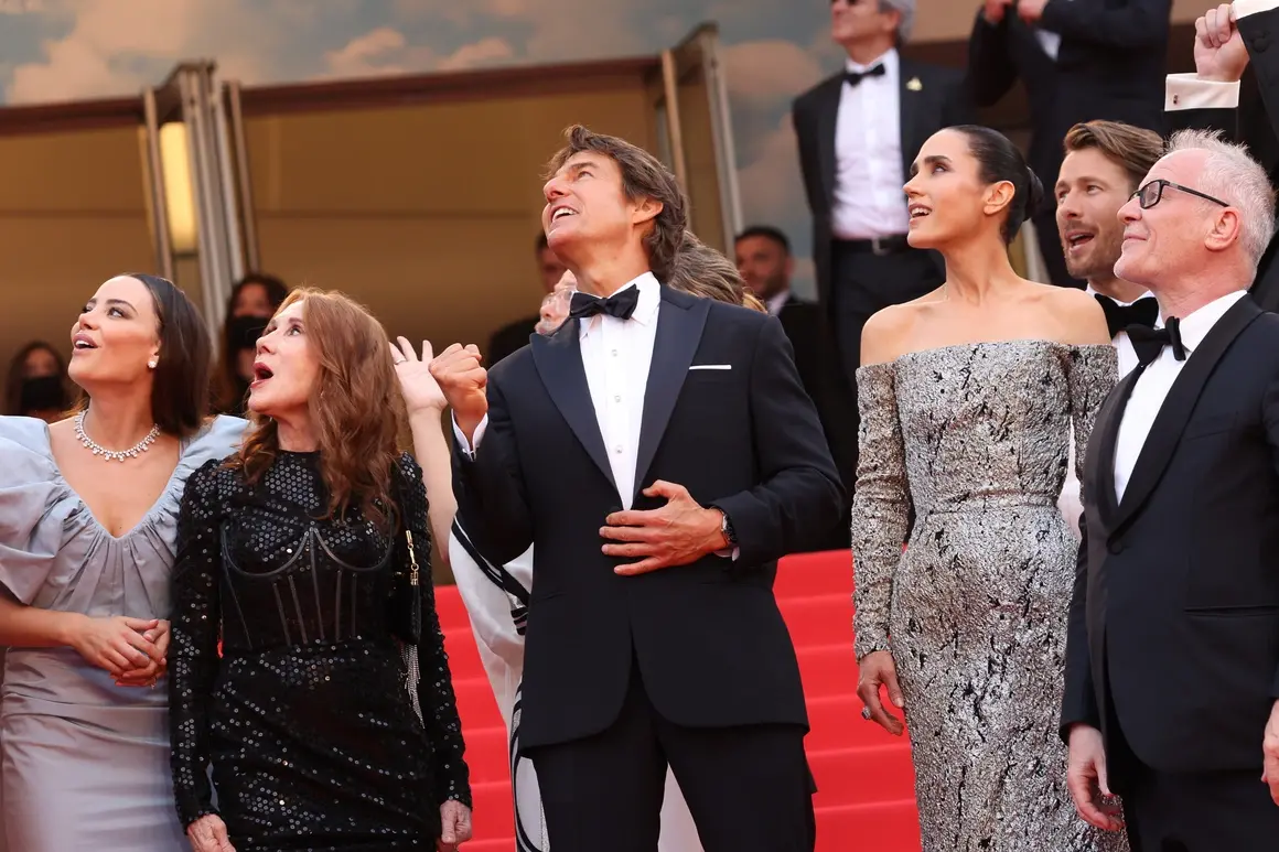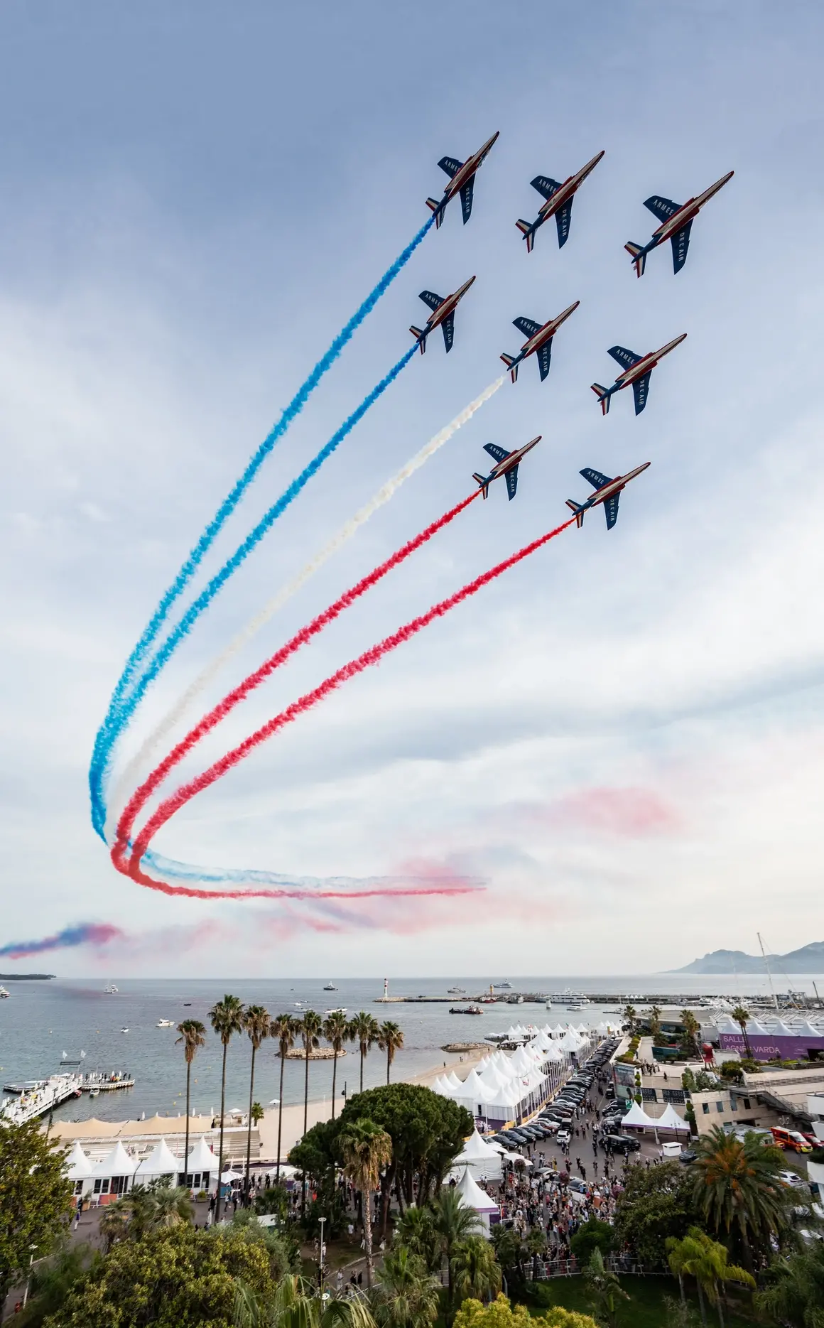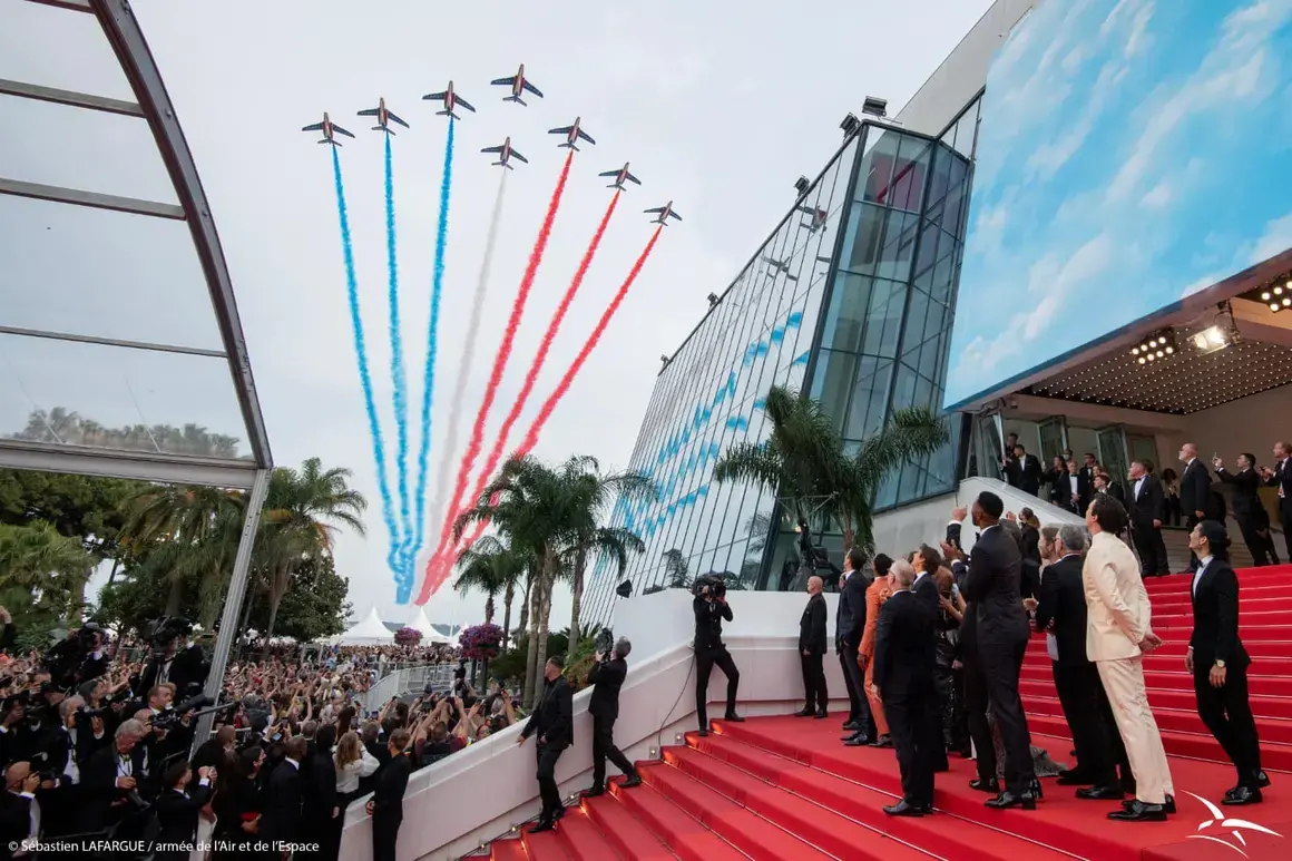 Докато звездите от "Top Gun: Maverick" се снимаха на червения килим преди дългоочакваната премиера в Кан, в небето над Лазурния бряг прелетя група от изтребители от Френските ВВС - Patrouille de France.
