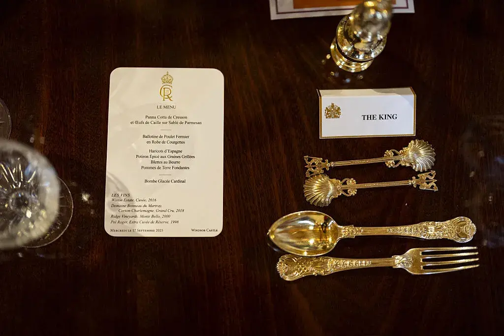 Менюто също беше внимателно подбрано. Включваше панакота от кресон, бифтек от органично пиле от Норфолк и бомбé от ванилов сладолед с малиново сорбе, придружени от селекция от изискани вина.
