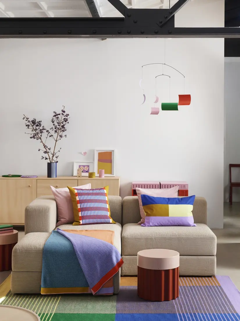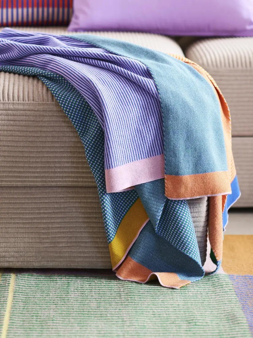 Плетеното одеяло TESAMMANS демонстрира тази идея с графични линии и плътни цветове. От разстояние изглежда, че нюансите преливат един в друг, но отблизо се отличат отделните багри.
