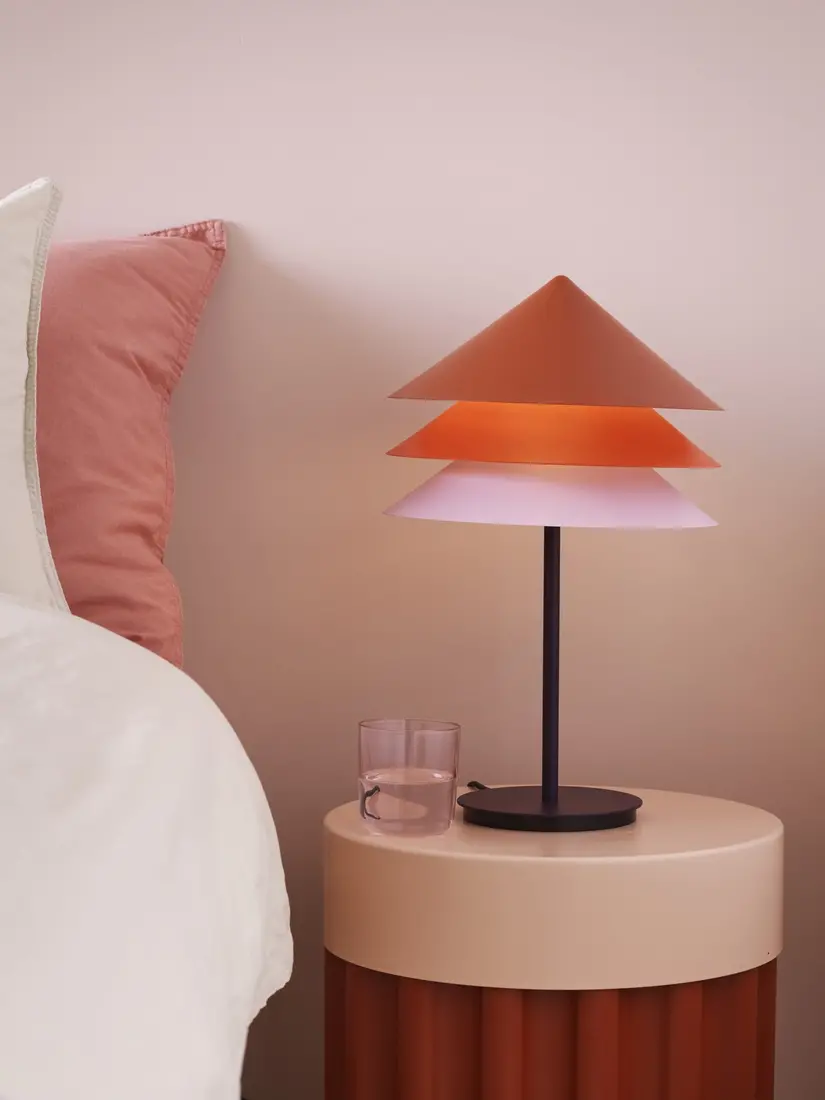 Концепцията продължава и при абажурите. Те са налични в два размера за окачване или поставяне на маса. Дизайнът включва три абажура, които преминават от тъмни към по-светли тонове и създават различни отражения, докато улавят светлината.