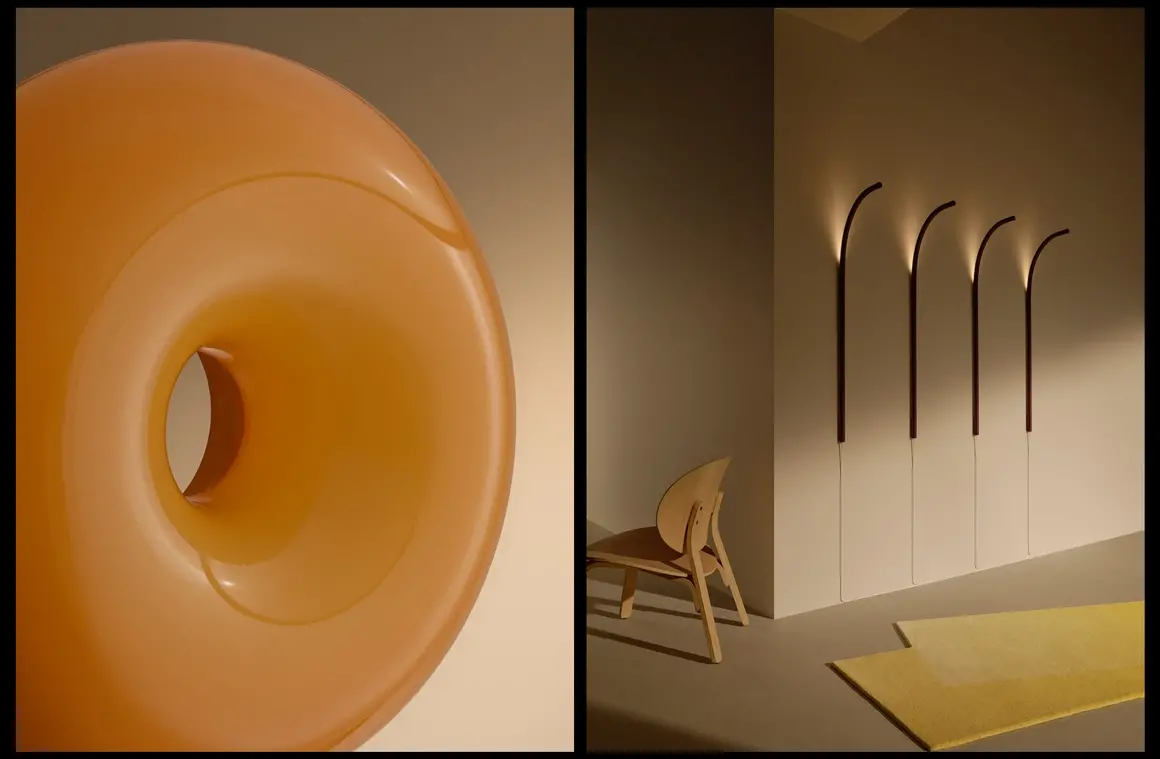 „Когато светлината преминава през оранжевото стъкло, овалната форма, наподобяваща поничка, блести с топъл оттенък“, споделя Сабин Марселис.