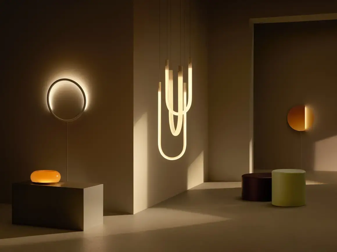 Акцентите в колекцията включват още LED висяща лампа с извити рамене, която е изработена от матово бяло стъкло, и LED огледало за стена, проектирано с полупрозрачен стъклен панел и светлинна лента.