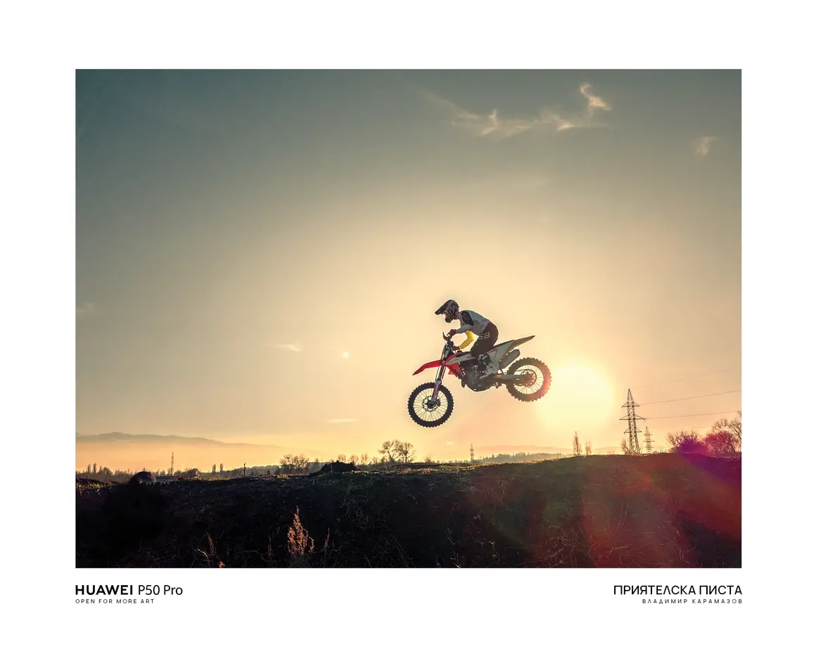 „Huawei P50 Pro разполага с някои много мощни функции, една от които е за снимане на бързодвижещи се обекти. С него направих снимка на една мотокрос писта, на момчета, които хвърчат с бясна скорост. При това снимката е на залез слънце, слънцето е срещу телефона. Доста малко камери с цени над 7-8 хиляди лева могат с лекота да направят това.“, част от историята зад кадъра „Приятелска писта“.