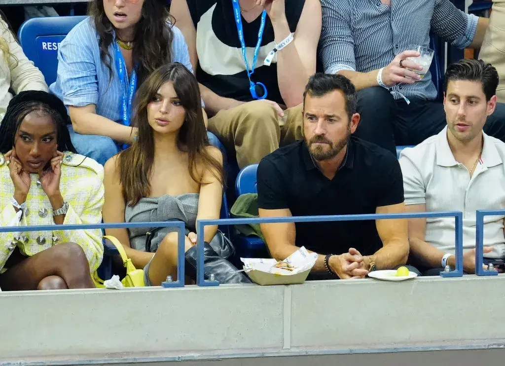На снимката - моделът Емили Ратайковски и актьорът Джъстин Теру следят поредното разиграване на Джокович и Медведев.