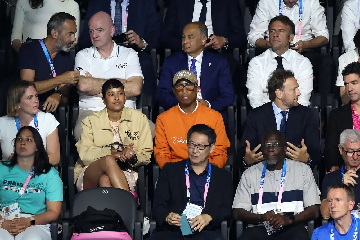 Лично френският президент Еманюел Макрон беше сред публиката в La Defense Arena, докато детето-чудо на плуването Леон Маршан печелеше поредния си златен медал. До него е и Джани Инфантино - президентът на ФИФА.